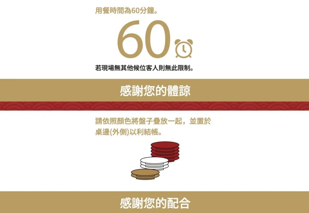 寿司郎不仅军事化管理食材,消费者来了也要军训,500平米的大店叠加堪比付费自习室的空间利用,一次最多能容纳365人[7],翻台率也进一步提高,高峰期能达到10~15次/天,为了把流水线的运转效率提高到极致,还会在每桌用餐1小时后委婉提醒。