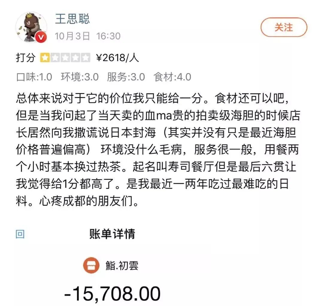 见惯了世面的王思聪,曾两次大战高端日料店,在人民群众之间获得一片共鸣。一次是在成都花了一万五给出一星差评,另一次是怒斥上海日料店临时加价、态度傲慢。