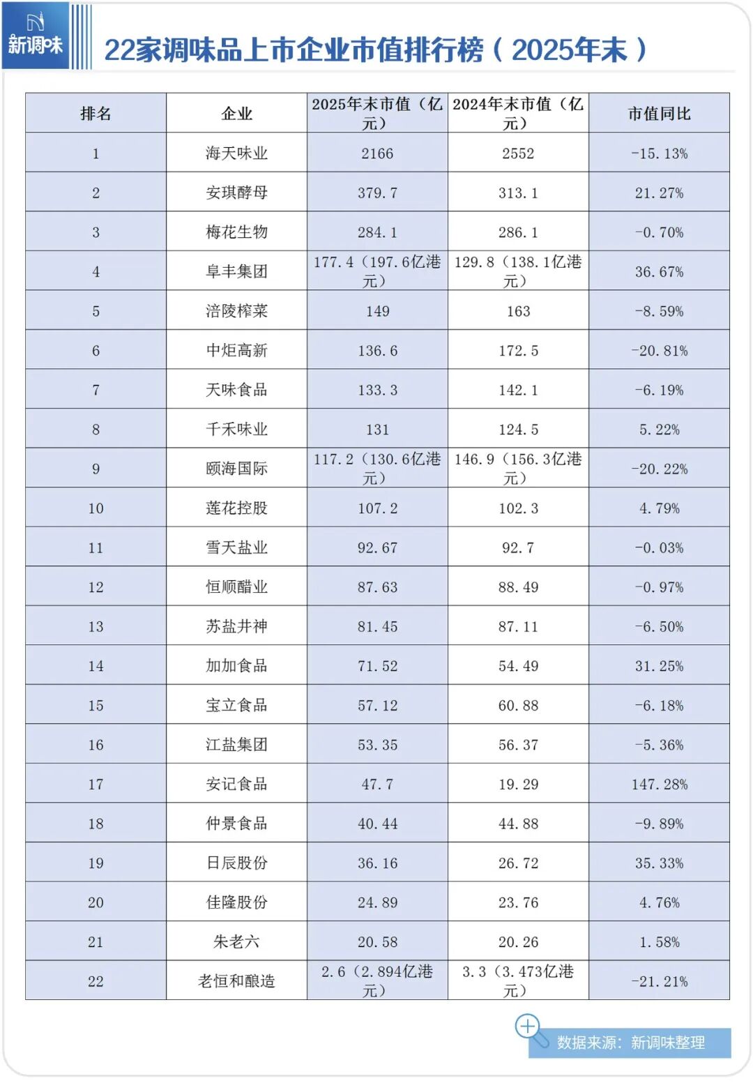 新调味盘点了2025年末22家调味品上市企业(含A股、港股)的市值,并以人民币为单位从高到低进行呈现。
